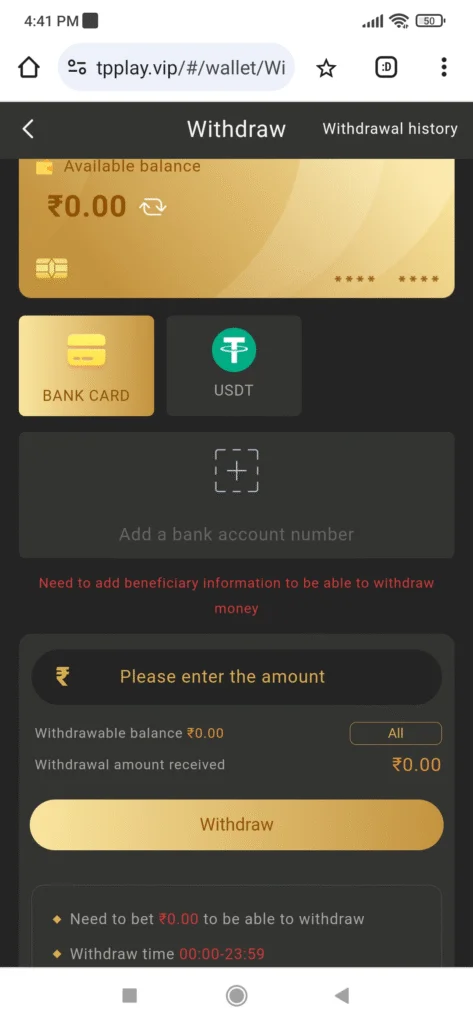 To withdraw money from Tp Play Game, first log in to your account and go to the Wallet or Withdrawal section. Enter the amount you want to withdraw and provide your payout details, such as your bank account or UPI ID. Make sure your KYC details are verified, as this is required for successful withdrawals. After confirming your request, the transaction will be processed, usually within a few hours, and the money will be transferred to your account.